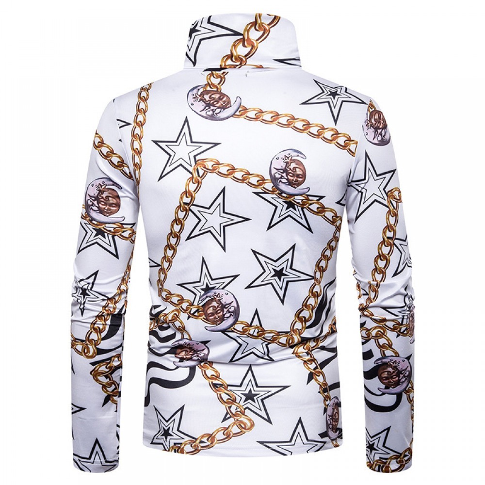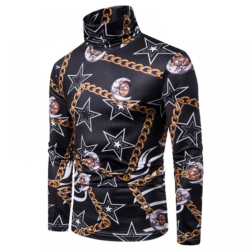 New Men's Large Size 3D Star Chain Print High Neck Long Sleeve T-Shirt Bottoming Shirt